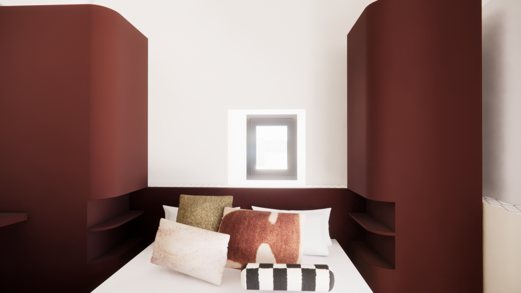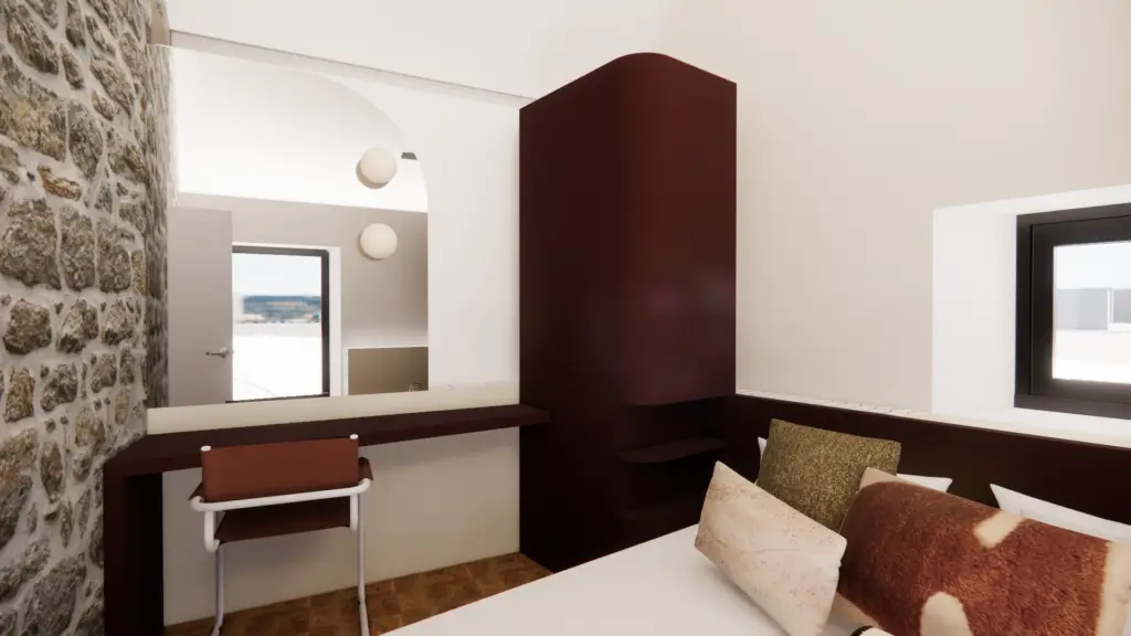 La palette de matériaux associe les murs en pierre existants à des volumes en bois teinté dans des tonalités rouge brun qui apportent chaleur et profondeur visuelle. L’appartement propose ainsi une lecture actuelle de la maison bretonne, où les formes courbes, les matières et les volumes dialoguent pour créer un intérieur à la fois intime et architectural.