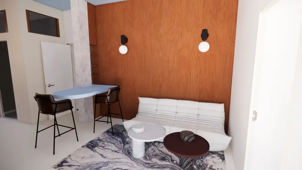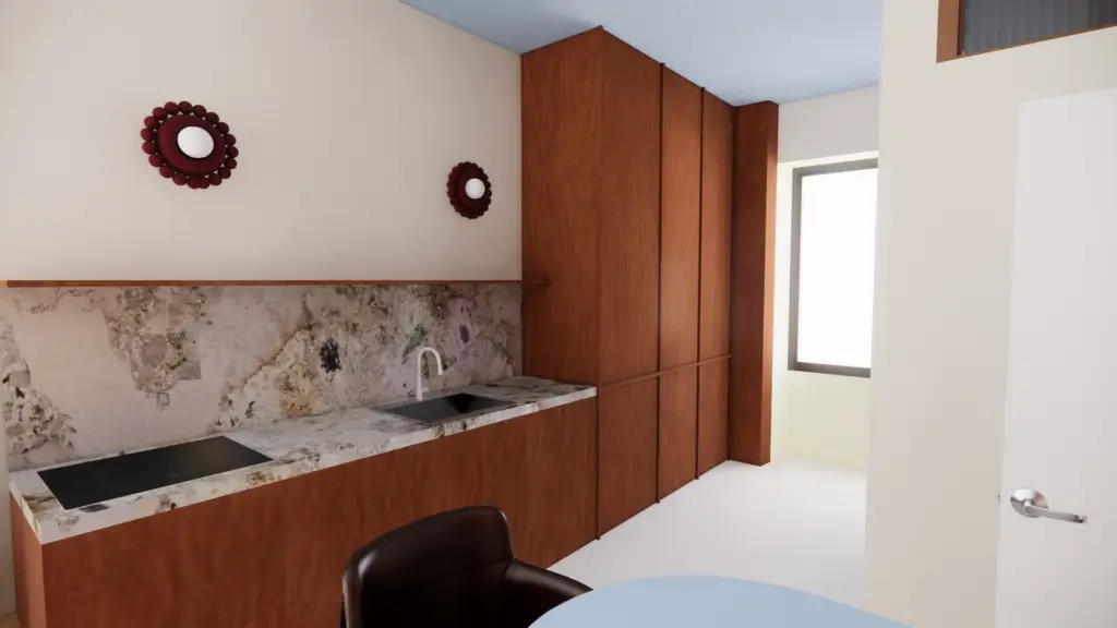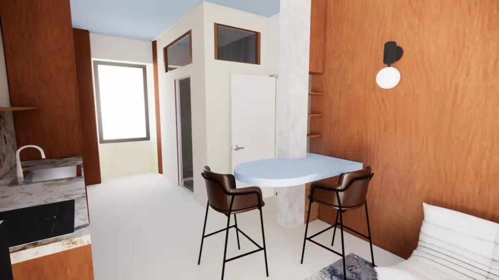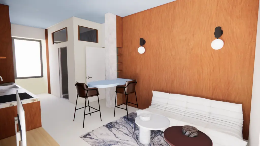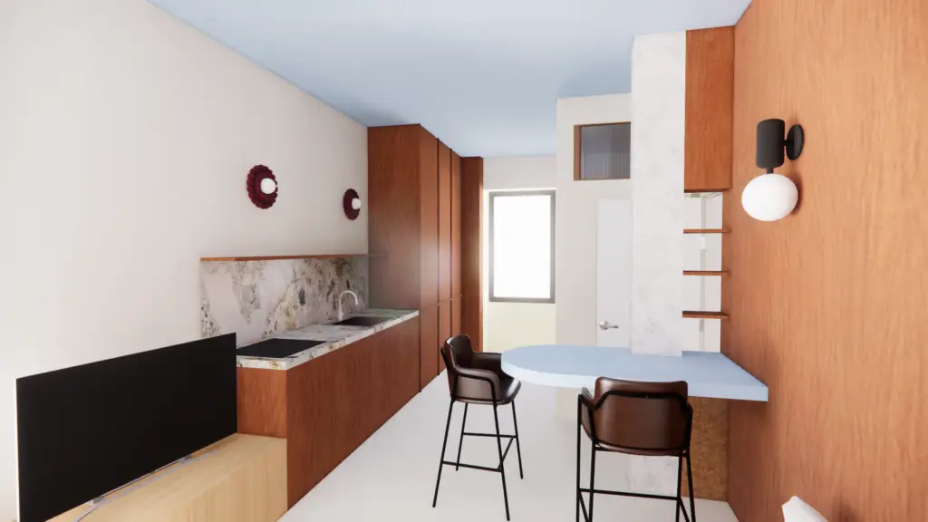 L’espace est pensé comme un intérieur compact et fluide où chaque fonction trouve naturellement sa place. La cuisine se développe en linéaire le long du mur et un îlot sculptural sert à la fois de table et de point de transition entre les différentes zones. La chambre s’inscrit dans une alcôve intégrée qui combine tête de lit, rangements et étagères.